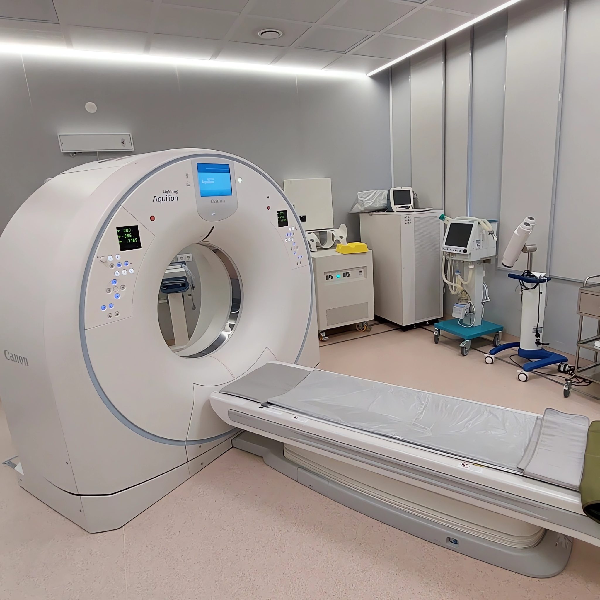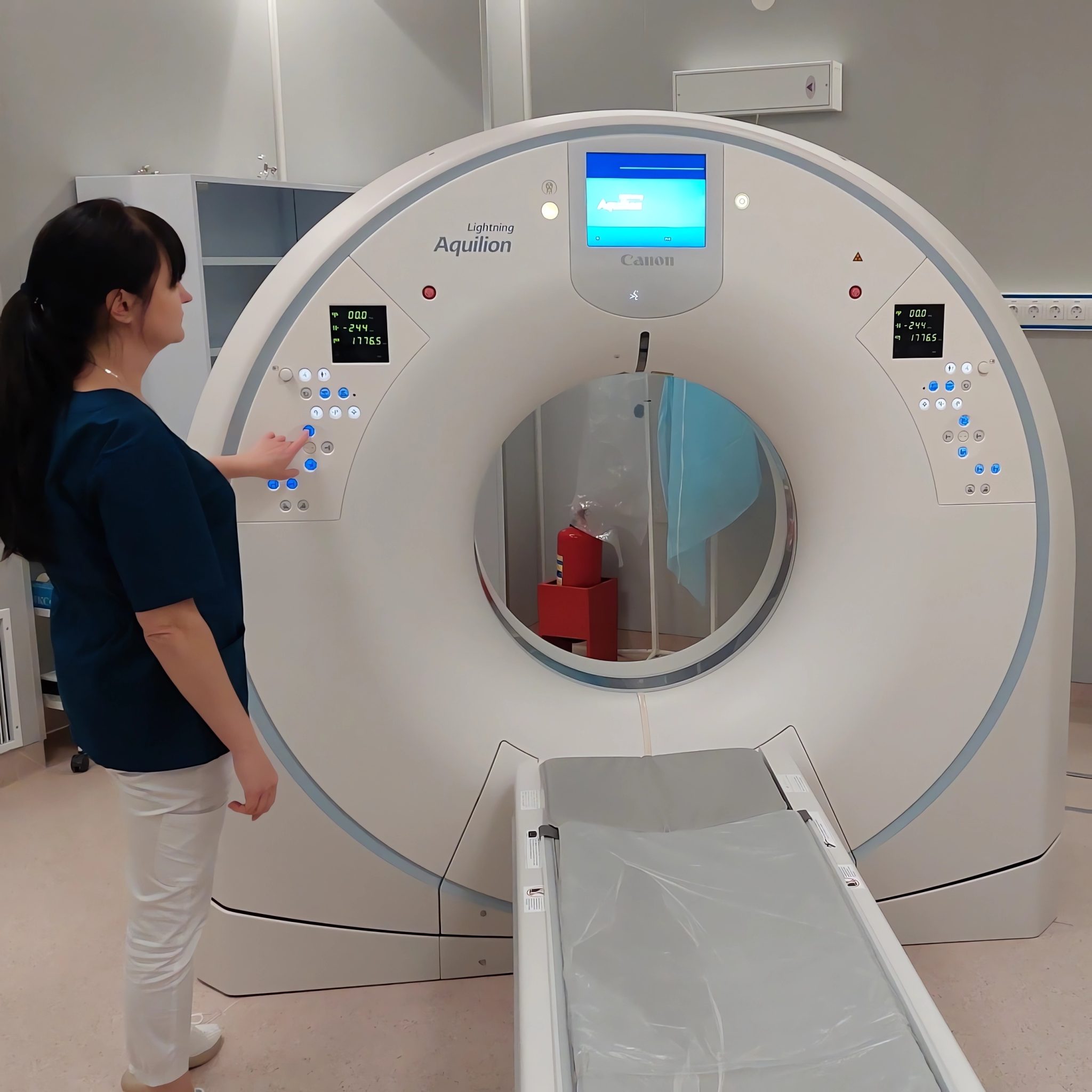 Кабинет рентгеновской компьютерной диагностики оснащен рентгеновским компьютерным томографом Lightning Aquilion TSX-036А (2019 года выпуска, Canon, Япония), 80-срезовым, выдерживающим вес пациента — до 200 кг.